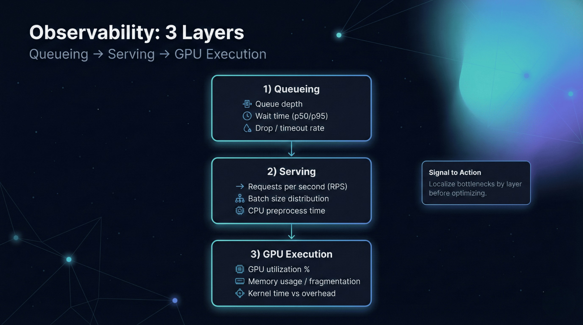 Monitoring GPU utilization alone is not enough. Utilization can drop simply because traffic drops. The signals that matter are system-level: queue wait time, throughput, batch size distribution, and tail latency.