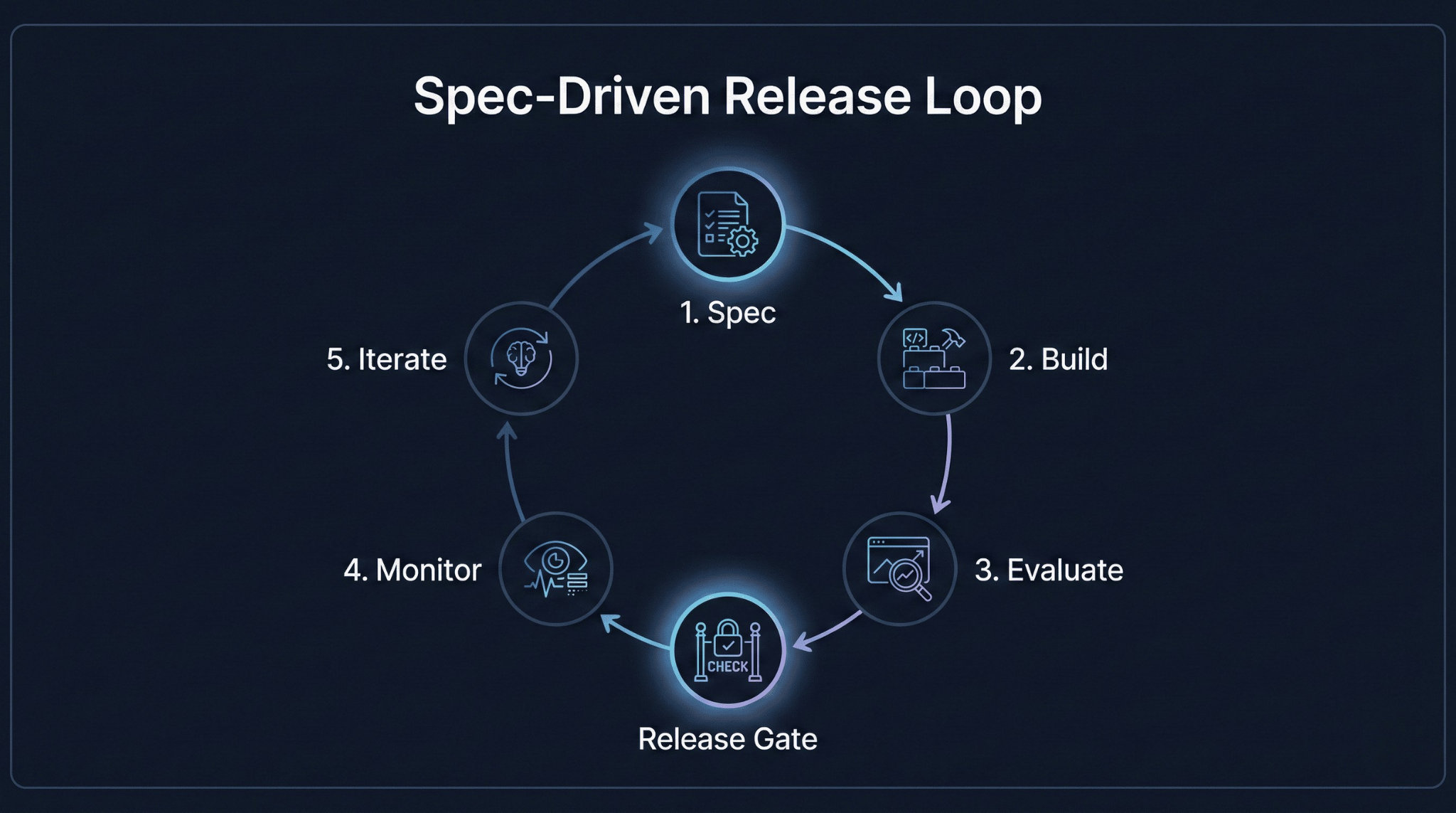 A production-ready spec turns evaluation into an explicit contract: target thresholds, acceptable variance, latency and cost budgets, and compliance boundaries. It also defines the evaluation harness—what test sets matter, how regression is detected, and what constitutes a release blocker.