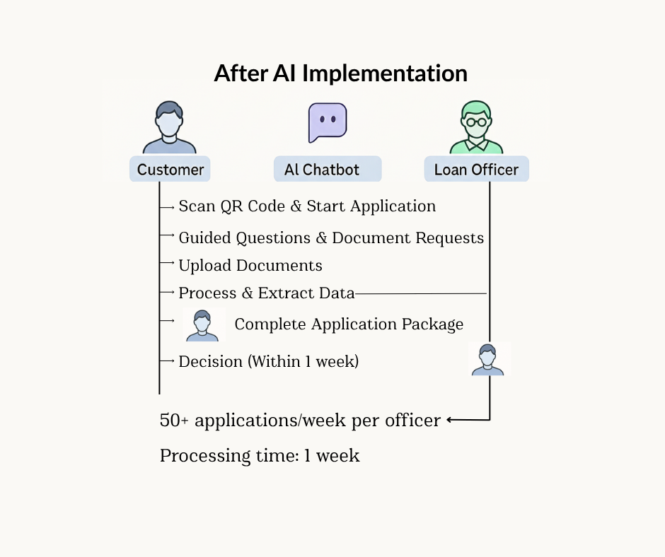 Applications per officer: Increased from 20 to 50+ → 2.5× productivity
